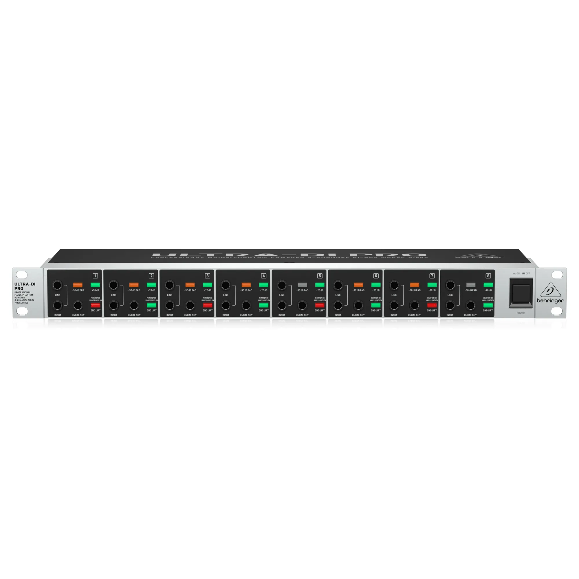 O ULTRA-DI PRO DI800 é uma DI-box ativa profissional de 8 canais com alimentação phantom/rede elétrica. Se você precisa de uma unidade DI montável em rack com entradas suficientes para acomodar todos no palco ou no estúdio, então você precisa conectar na DI800.