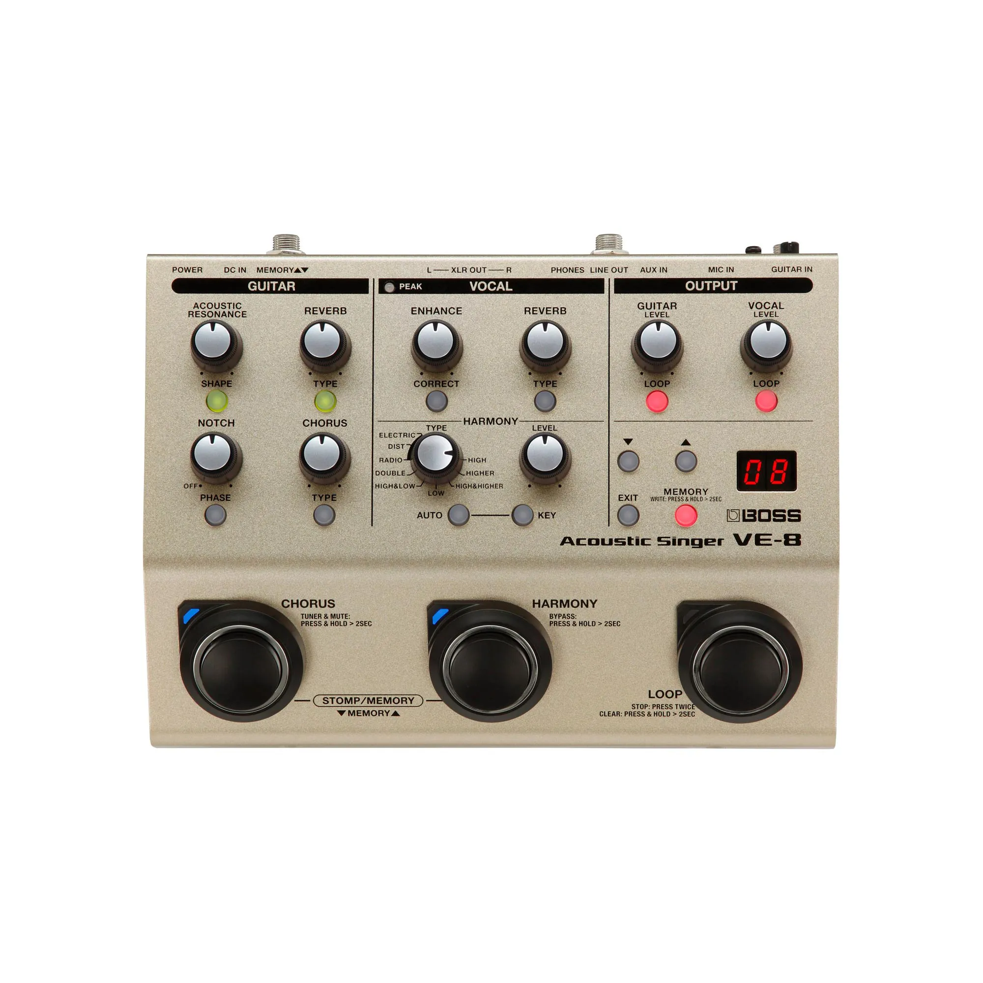 Para cantores/compositores que tocam violão, o mundo está cheio de competitividade. O VE-8 Acoustic Singer oferece aquele toque extra que você precisa para se destacar e brilhar, ajudando com o som profissional BOSS cada vez que se apresentar. Simples de usar, o VE-8 oferece alta qualidade de estúdio ao processamento de voz e violão, além de impressionantes harmonias e loops em tempo real, em uma unidade compacta e portátil. Com grande capacidade sonora e recursos poderosos e criativos, a casa vai cair toda vez que você se apresentar.
