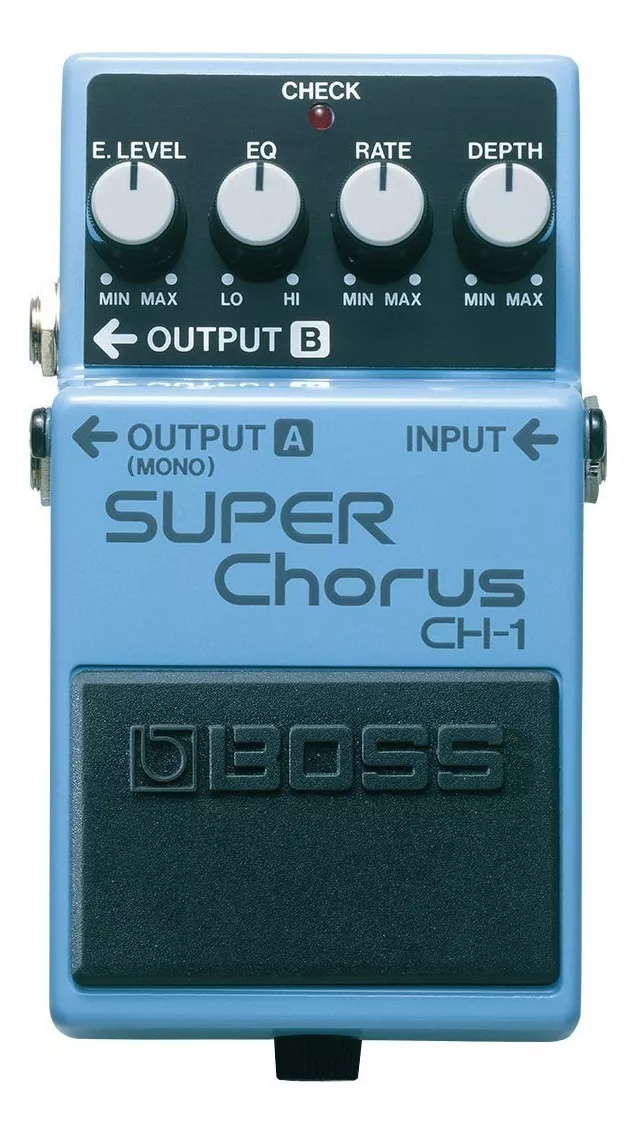 O CH-1 Super Chorus destaca-se por timbrar agudos mais limpos. O efeito chorus estéreo varia com a distância entre os alto-falantes, gerando um efeito espacial que é a marca registrada do efeito de chorus da BOSS. A função EQ ajusta tonalidades quentes e suaves até as mais encorpadas, ideais para tocar guitarra base.